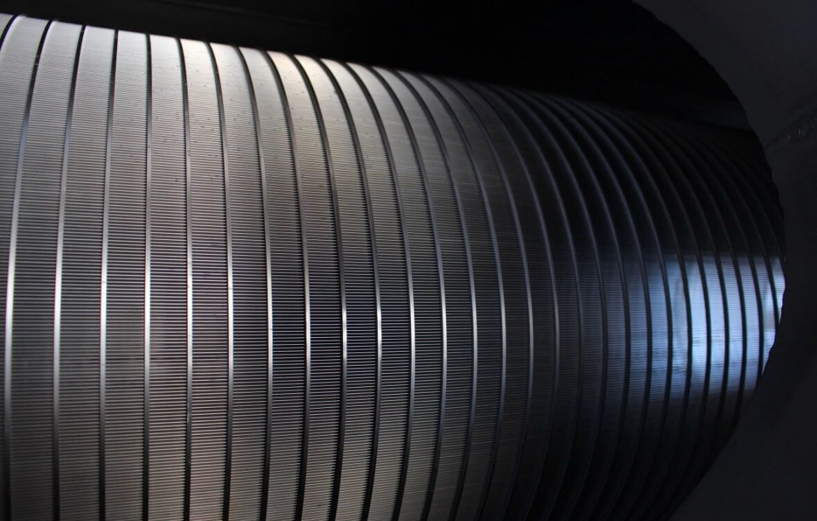 Unser DN 400 Bernoulli-Filter aus Edelstahl filtert beeindruckende 1350 m³/h Wasser aus der Einspritzkondensation, ausgestattet mit einem präzisionsgefertigten 0,5 mm Spaltrohrkorb.